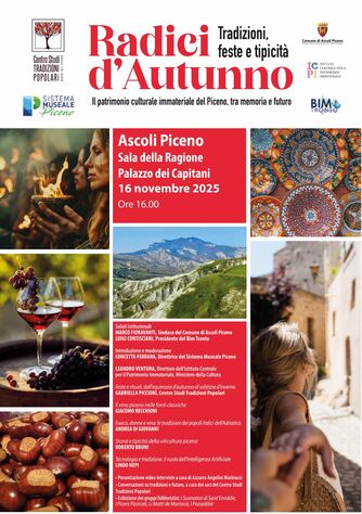 l Sistema Museale Piceno, in collaborazione con il Centro Studi Tradizioni Popolari e con il supporto del BIM Tronto e del Comune di Ascoli Piceno, promuove il convegno “Radici d’Autunno. Tradizioni, feste e tipicità”, un appuntamento dedicato alla riscoperta e alla valorizzazione del patrimonio culturale immateriale del territorio, in un dialogo costante tra memoria e futuro.