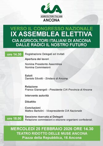 Si svolgerà domani, 25 febbraio, a partire dalle 14:30 presso il Teatro Ridotto delle Muse di Ancona, la nona Assemblea Provinciale Cia Ancona. L’assemblea, dal titolo “Dalle radici il nostro futuro”, rappresenta un momento centrale di confronto, partecipazione e democrazia associativa, in cui verranno tracciate le linee guida per il futuro dell’organizzazione provinciale e del comparto agricolo.