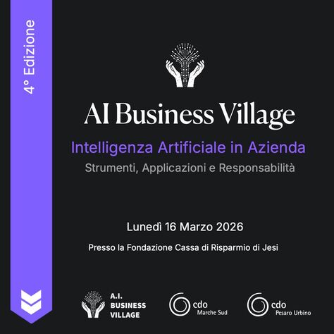 L’Intelligenza Artificiale entra sempre più nei processi decisionali, organizzativi e strategici delle imprese. Per aiutare le figure manageriali, imprenditoriali e professionali a comprenderne le potenzialità e governarne l’impatto, nasce A.I. Business Village, l’evento organizzato da Compagnia delle Opere Marche Sud e Compagnia delle Opere Pesaro Urbino dedicato all’AI in ambito aziendale in programma lunedì 16 marzo 2026, dalle ore 14:00, presso la Fondazione Cassa di Risparmio di Jesi.